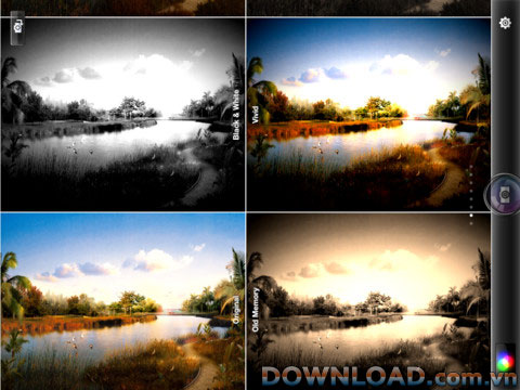 Hiệu ứng màu như: Grayscale, Sepia, RedEye, Cartoon, Sketch, Charcoal, Lomo, Pencil Sketch, Pastel Sketch, X-Ray, Inversion, Brightness, GreenEye, Contrast, Old, Color channel switch(R-G, R-B, G-B) (18 hiệu ứng).