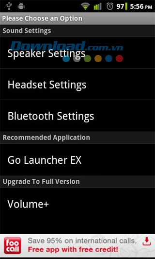 Volume+ Free for Android còn cho bạn 3 chế độ tùy chỉnh là: loa ngoài, tai nghe và kết nối tai nghe qua Bluetooth.